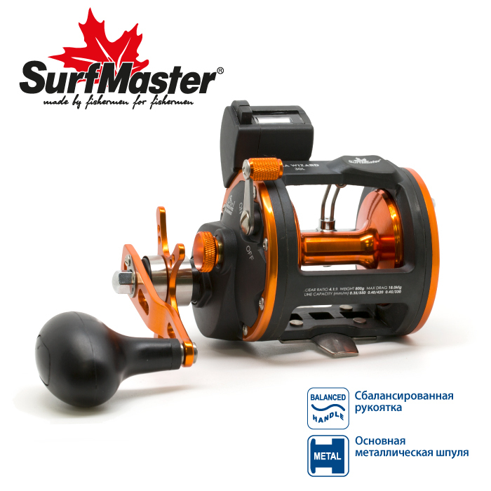 Surf Master Sea Wizard - силовая катушка с точенной алюминиевой шпулей. Катушка оснащена 4-мя подшипниками из нержавеющей стали. Для контроля длины отпуска приманки или глубины лова, катушка оснащена счетчиком лески в метрах. Вал шпули выполнен из нержавеющей стали. Остальные детали катушки имеют специальное антикоррозийное покрытие. Облегченное карбон композитное тело усилено металлическими накладками. Основные рабочие агрегаты катушки выполнены из металла: усиленная металлическая ручка, звездочка регулировки фрикциона, рычаг разблокировки свободного хода шпули, винт регулировки свободного хода шпули. Для увеличения надежности работы катушки, блокировка свободного хода шпули производится с помощью рычага. Прямое тяговое усилие 18 кг. Увеличенная обрезиненная рукоять.