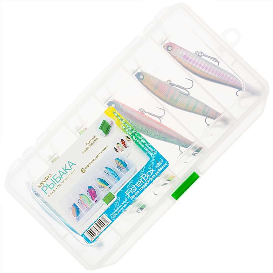 Коробка FisherBox 216 это небольшая, удобная коробка с шестью отделениями. Коробка FisherBox 216 разрабатывалась для использования в разгрузочных рыболовных жилетах, поэтому можете смело положить её в карман такого жилета, при этом Вы не будете чувствовать дискомфорта даже во время активных движений. Для изготовления коробки используется прозрачный морозоустойчивый пластик, способный выдержать большие ударные нагрузки и суровую погоду. FisherBox 216 оснащена стандартной сменной защёлкой для надёжного хранения содержимого. Также на крышке коробки расположены специальные треугольные отливы для большей прочности замка. Вес 160г.
