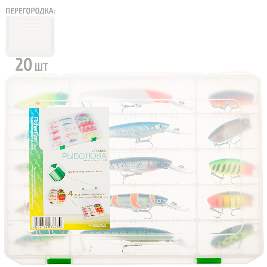 Коробка FisherBox 310 - оборудована двумя защёлками, которые достаточно просто открыть и закрыть, и, в то же время, самопроизвольные открытия коробки, например, при тряске, исключены полностью. Глубина коробки FisherBox 310 позволяет в один отсек поместить несколько приманок, что делает коробку очень вместительной. Коробка разделена на пять горизонтальных отсеков, с возможностью образовать большое количество мелких отделений, для хранения всевозможной рыболовной продукции. В комплекте 20 съемных разграничителей. Данная коробка отлично подойдёт не только для транспортировки, но и длительного хранения силиконовых приманок различных фирм. т.к. пластик из которого она изготовлена не вступает в реакцию с содержимым. Коробка FisherBox 310 в силу своих размеров и конструкции подойдёт для хранения любых рыболовных принадлежностей, будь то воблеры, блесна, силикон, крючки, поводки, различная фурн