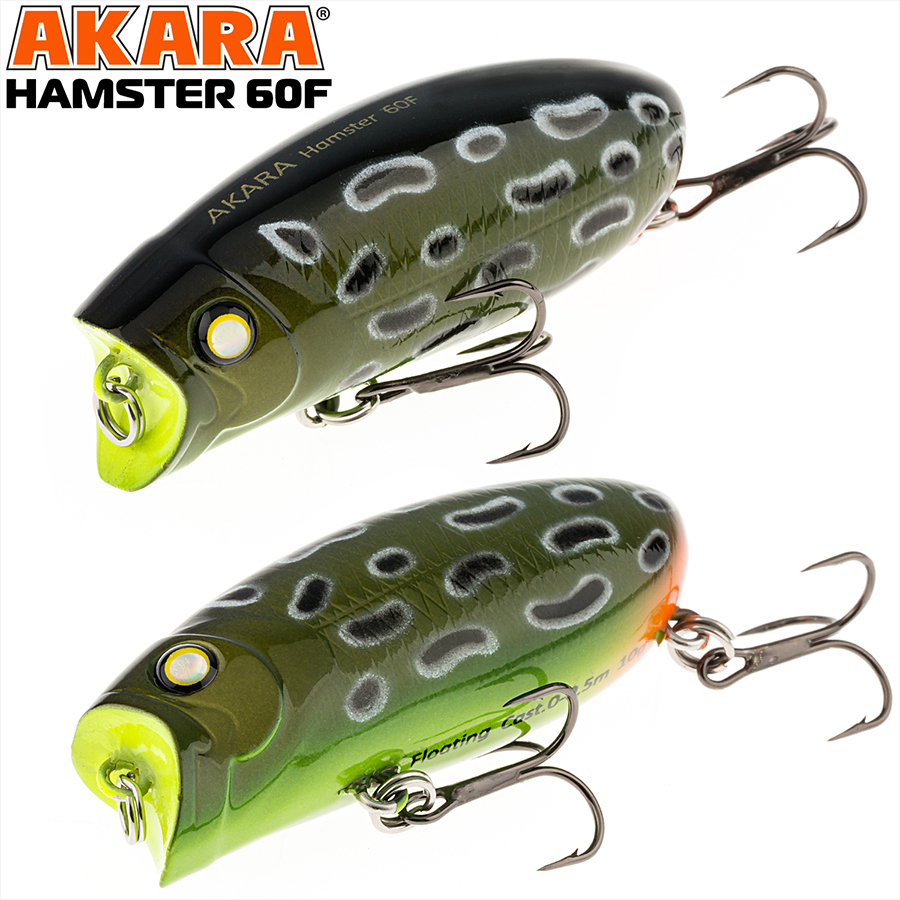 Akara Hamster 60F - воблер, собравший в себе лучшие качества поппера, волкера и подповерхностной приманки. В зависимости от стиля проводки спиннингист контролирует поведение этой приманки на и под водой. При рывковой анимации воблер ведёт себя, как поппер, активно разбрызгивая воду и создавая привлекательные для хищника звуки. При этом приманка идет из стороны в сторону, оставляя на поверхности воды характерные усы. При равномерной проводке воблер может заглубляться до 30 см, игра активная с ярко выраженными движениями вокруг своей оси. Отличная приманка для ловли щуки, окуня и других хищников в ограниченных условиях сложных водоемов. Плавающий. Акустический. Заглубление при кастинге 0 до 0,5 м.