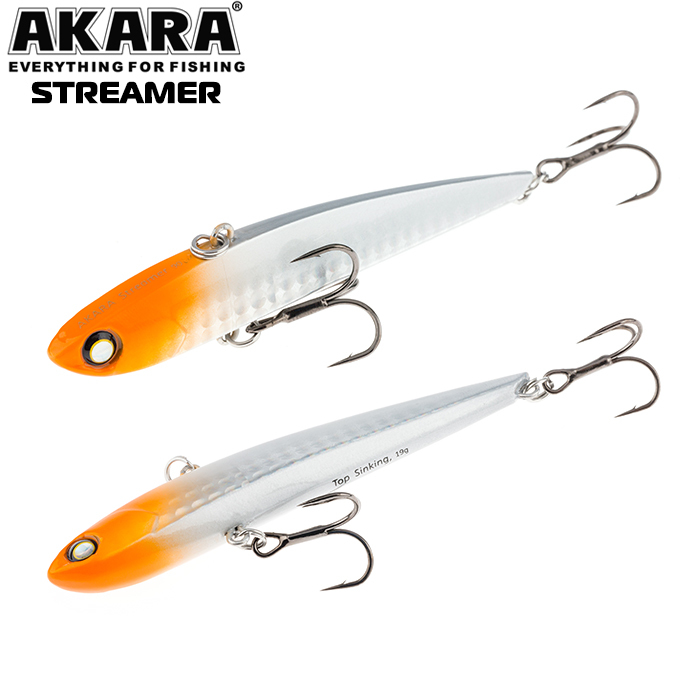 Akara Streamer - безлопастный воблер класса раттлин (rattlin). Приманка с прогонистой формой тела предназначена для отвесной ловли судака и окуня, а также других хищных рыб. Стабильно работает на водоемах любого типа, отлично держит сильное течение, не входит в штопор. Высокочастотная игра привлекает рыбу с дальних дистанций. Тип плавучести - быстротонущий.