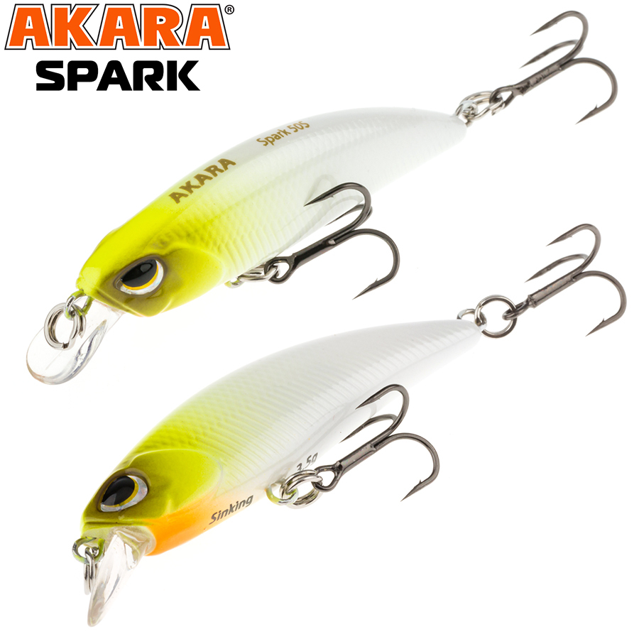 Akara Spark 50S - тонущий воблер типа минноу. Предназначен главным образом для ловли твичингом на течении. Хорошо держит струю и позволяет облавливать разные горизонты. При резких движениях поднимается выше к поверхности, а при плавных потяжках идет ближе ко дну. По мимо ловли на реках Akara Spark 50S занял достойное место и при ловли на стоячих водоемах. Благодаря небольшому обтекаемому телу воблер имеет небольшое сопротивление при забросе и позволяет его закинуть на значительное расстояние. Тонет воблер довольно быстро, поэтому им комфортно будет ловить на глубинах до трех метров. И, не смотря на его небольшой размер, его трофеем может оказаться крупный хищник. Металлические шарики в корпусе воблера создают при проводке акустический эффект, делая приманку более заметной добычей.