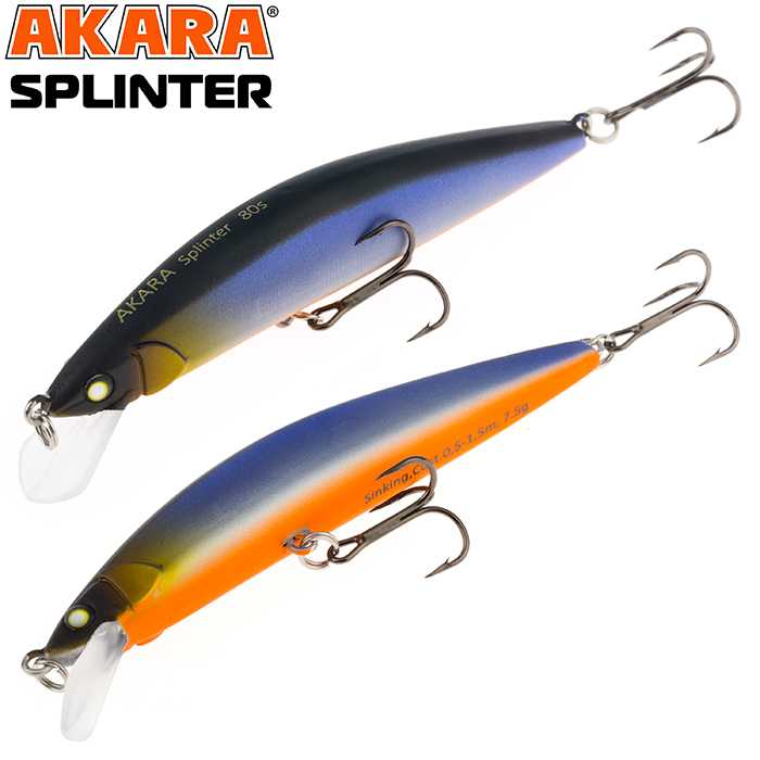 Akara Splinter - воблер класса минноу. Прекрасно подходит для твичинговой ловли. На равномерной проводке, имеет высокочастотную игру, которая отлично провоцирует рыбу к атаке. Благодаря компактной форме и весу, воблер очень хорошо летит, что позволяет осуществлять дальние забросы. Рекомендуется для ловли судака, окуня, щуки и других хищников. Тип плавучести - тонущий (S). Воблеры выполнены в двух размерах: 65мм - 5г, 80мм - 7,5г.