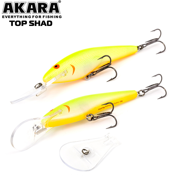 Top Shad 105F - тролинговый воблер класса шед с активной игрой. Основным применением примянки является облов всевозможных стоянок хищника – свалов, гряд и бровок. Широкая и толстая лопасть воблера позволяет снизить вероятность зацепа об камни и донный коряжник. Плавающий. Акустический. Заглубление при троллинге 3,5 - 5,0 м.