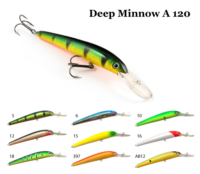 Deep Minnow A 120 - классический глубоководный миноу от Raiden. Обладает сверхчастотной, высокоамплитудной игрой с некоторыми переваливаниями с боку на бок. Такой игры удалось добиться благодаря более дальнему расположению кольца крепления на лопатке воблера. Особенностью данного воблера является существенное изменение характера игры, в зависимости от скорости проводки. При увеличении скорости проводки высота колебаний возрастает, а амплитуда падает, при уменьшении наоборот, вплоть до вялого переваливания с боку на бок. Данной особенностью с успехом пользуются опытные рыболовы, периодически изменяя скорость лодки при ловле троллингом, они тем самым провоцируют на поклёвку даже малоактивного хищника. Заглубление при троллинге от 2,0 до 4,5 м.