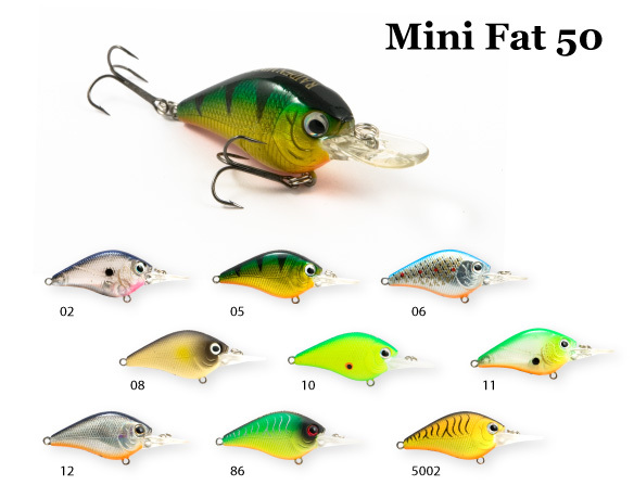 Mini Fat 50 - классическая модель типа fat характеризуется частой, мелкоразмашистой игрой. Безотказно провоцирует хищника на поклевку при ловле по теплой воде. Широкая цветовая гамма включает в себя две голографические расцветки (пищевую и раздражающую). Плавающий. Акустический. Заглубление при ловле в заброс от 1,5 до 2,5 м, при троллинге от 1,8 до 3,2 м.